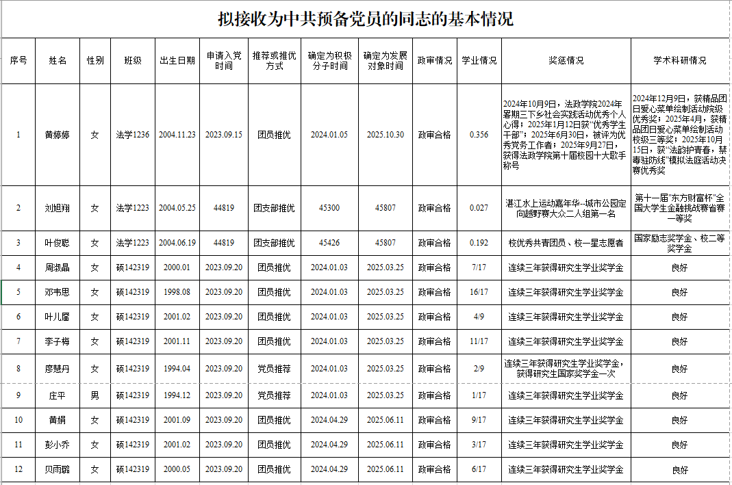 党委预审通过,拟接收黄婷婷等12位同志为中共预备党员。现将其有关情况予以公示,征求党员、群众意见。